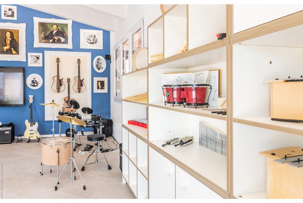 Il concept si basa sulla declinazione del linguaggio classico in chiave ironica e giocosa, adattandolo cosi all’aula di musica della scuola primaria. Lo scopo è stato riportare le atmosfere ed i retaggi storici della Sala delle Muse senza imitare pedissequamente lo stile classico, bensì usandolo come spunto per un nuovo linguaggio: