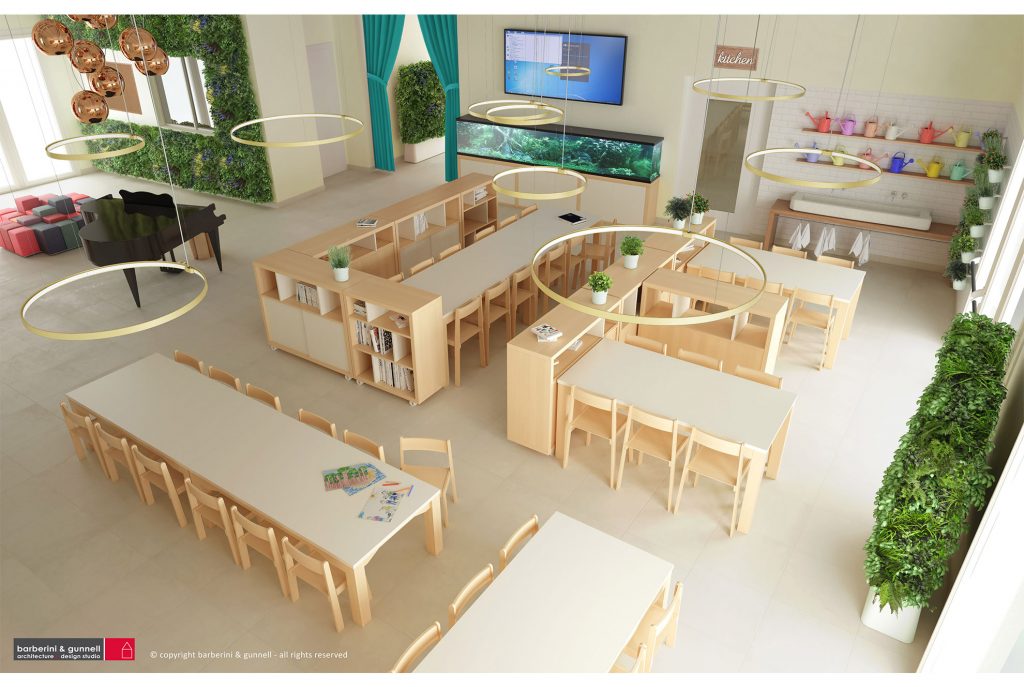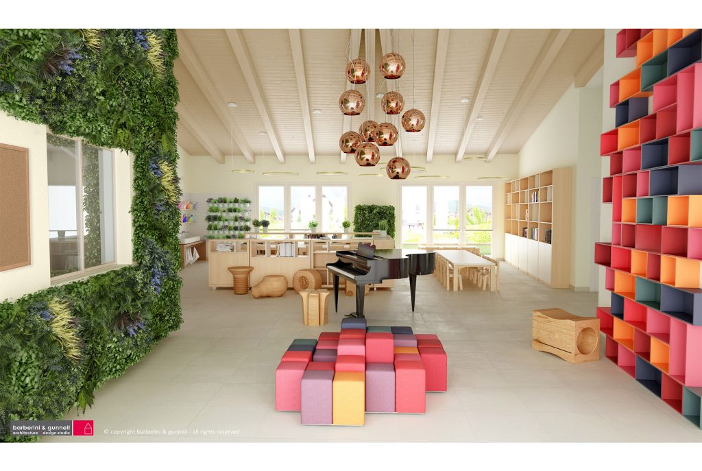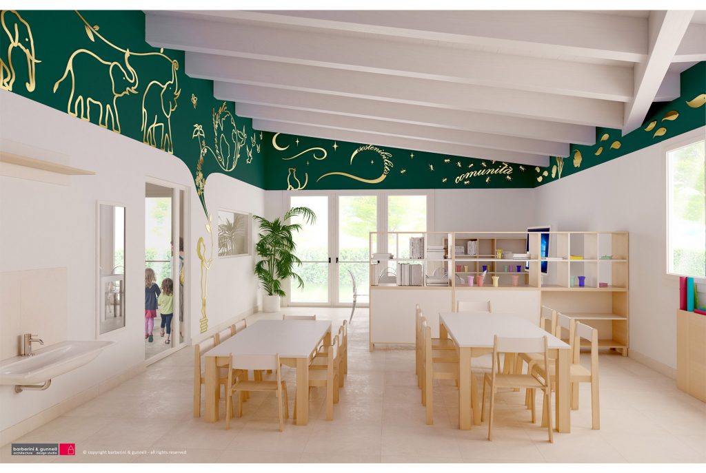 La volontà di emergere dall’austerità che contraddistingue molti edifici pubblici ci ha portato alla scelta di colori, finiture ed illuminazioni, che conferissero alla scuola una sensazione di calore e raccoglimento familiare. Tutti gli ambienti comuni sono arricchiti da molto verde che oltre a migliorare la qualità dell’aria creano un ambiente in stretto contatto con l’esterno sensibilizzando i più piccoli al rispetto dell’ecosistema.