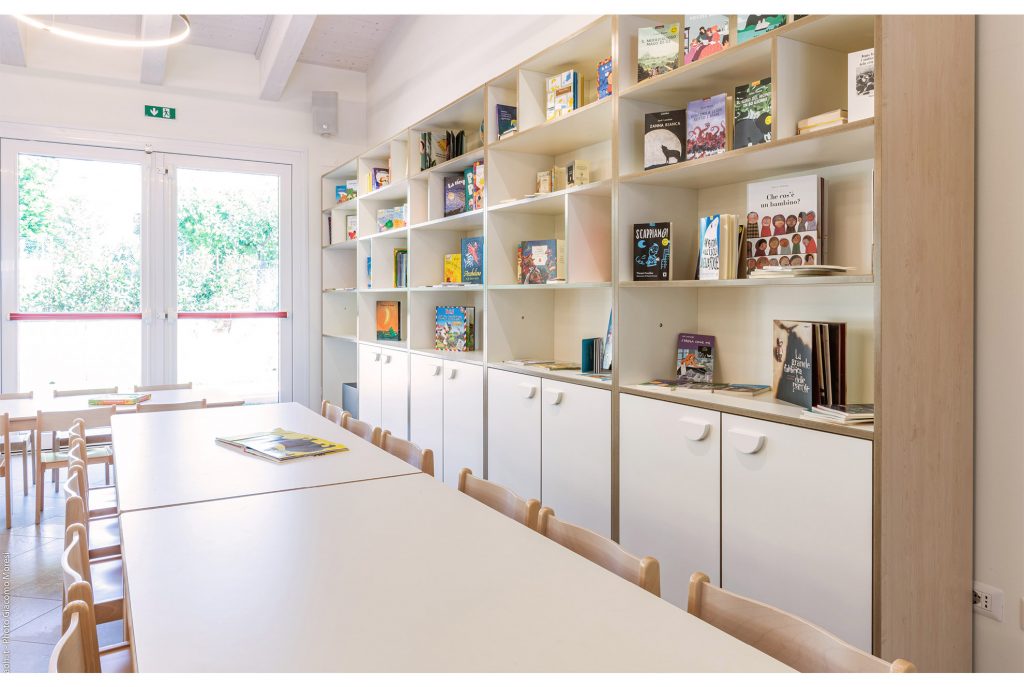 Questo grande ambiente centrale grazie a delle librerie modulari su ruote, progettate appositamente, può trasformarsi da mensa a biblioteca, da sala riunioni a cinema e cosi via creando infinite combinazioni.