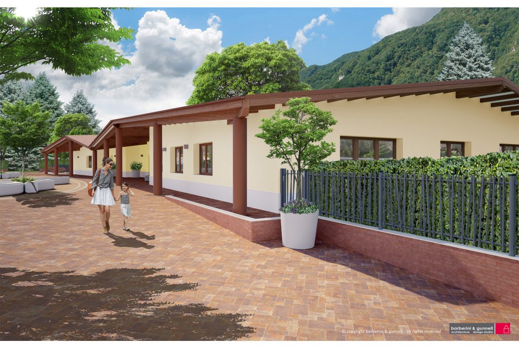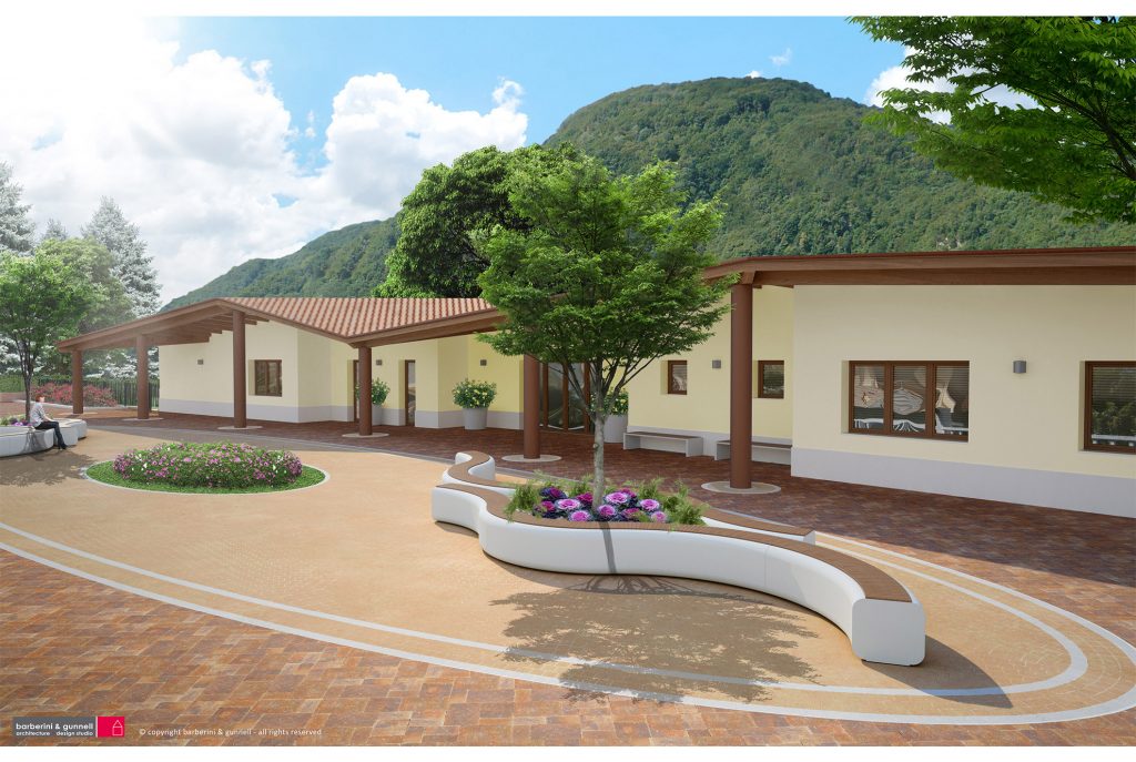 La comunità di Muccia dopo il sisma non ha più un paese, non ha più una casa, per questo abbiamo sviluppato il progetto pensando non solo ad una scuola per i più giovani ma ad un luogo comune, una grande casa che potesse donare un senso di protezione e quiete, di familiarità. Il grande viale che porta al parco si sviluppa come una piazza e trova la sua massima estensione proprio di fronte alla scuola, nella quale si protrae. L’entrata della scuola si apre ad un grande spazio molto arioso e luminoso che comunica direttamente con l’esterno.