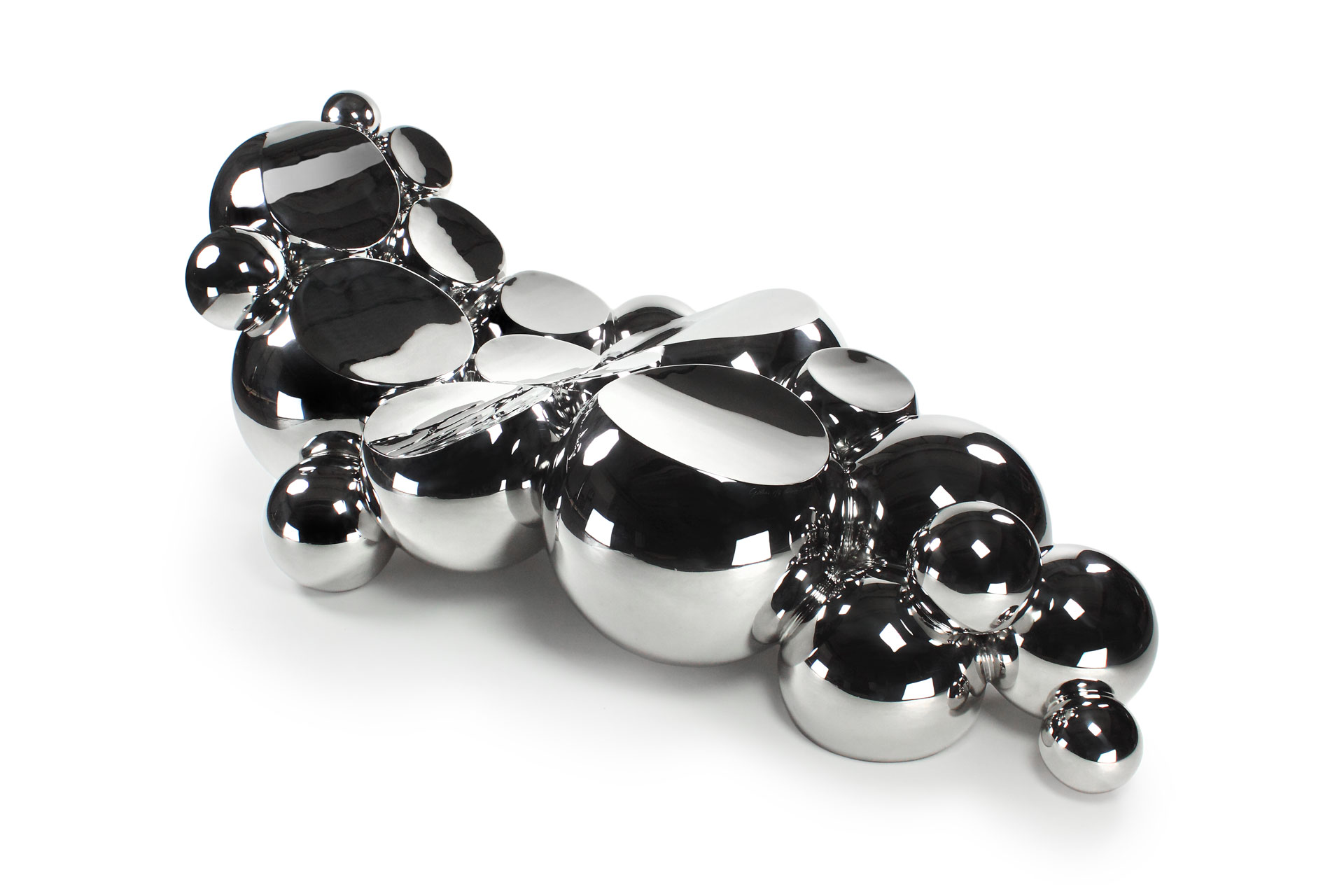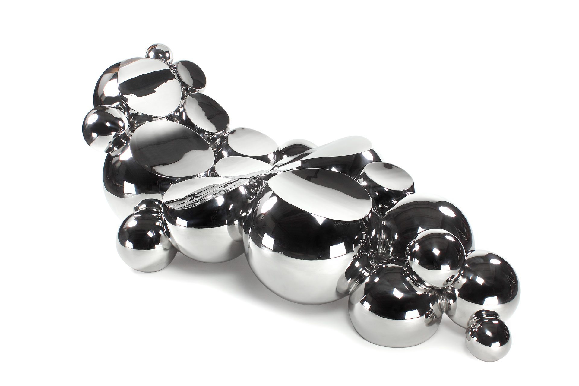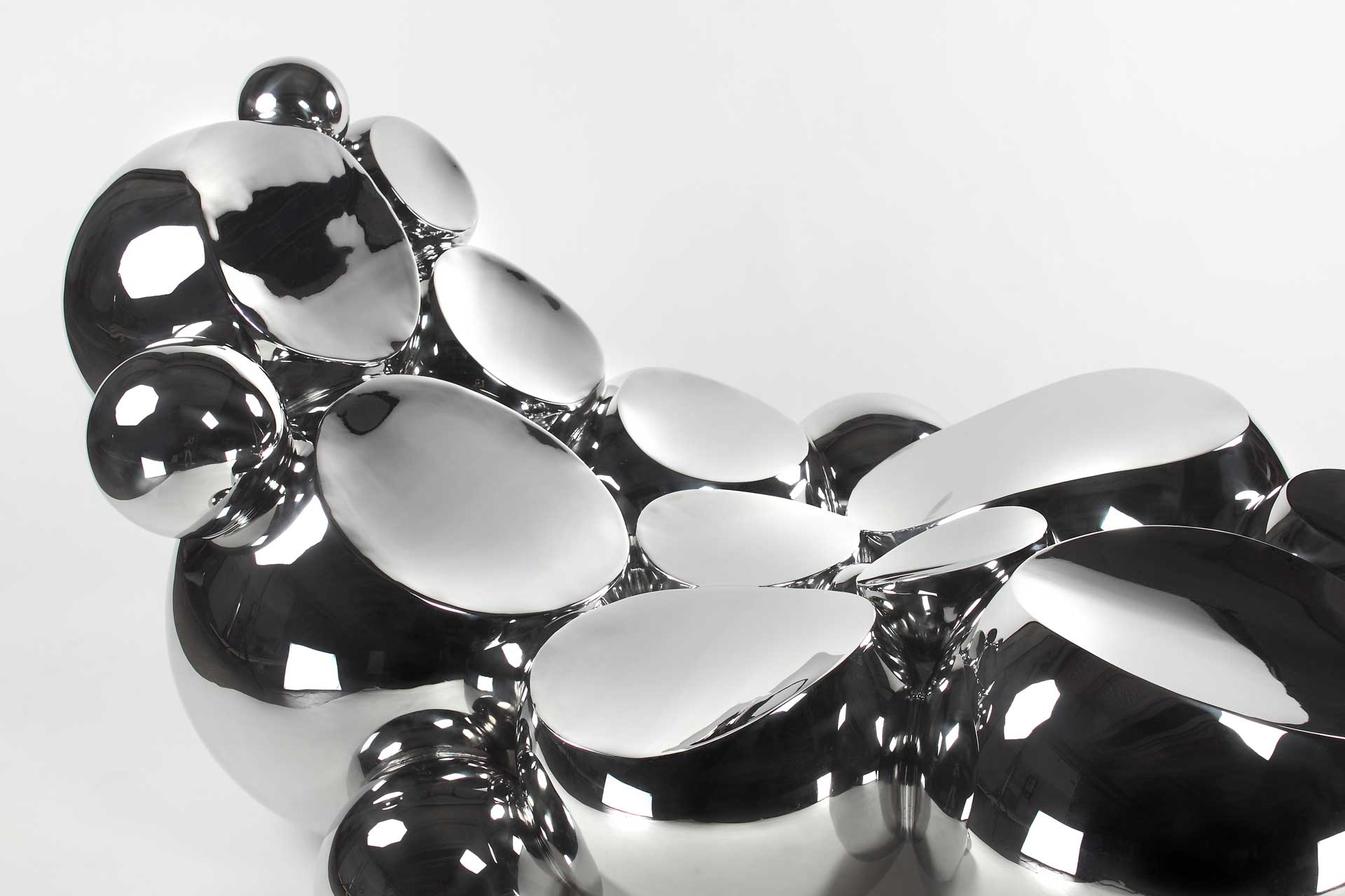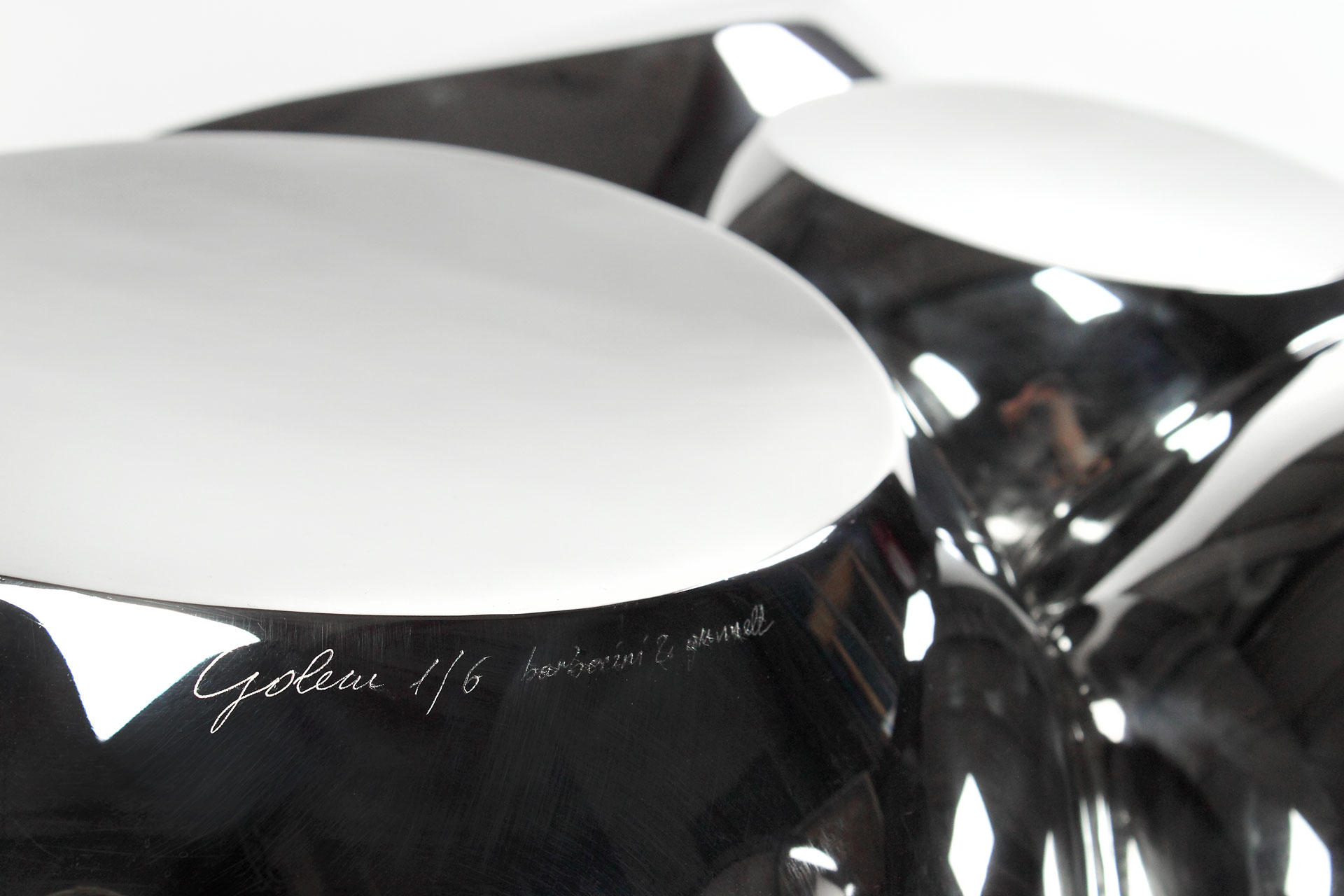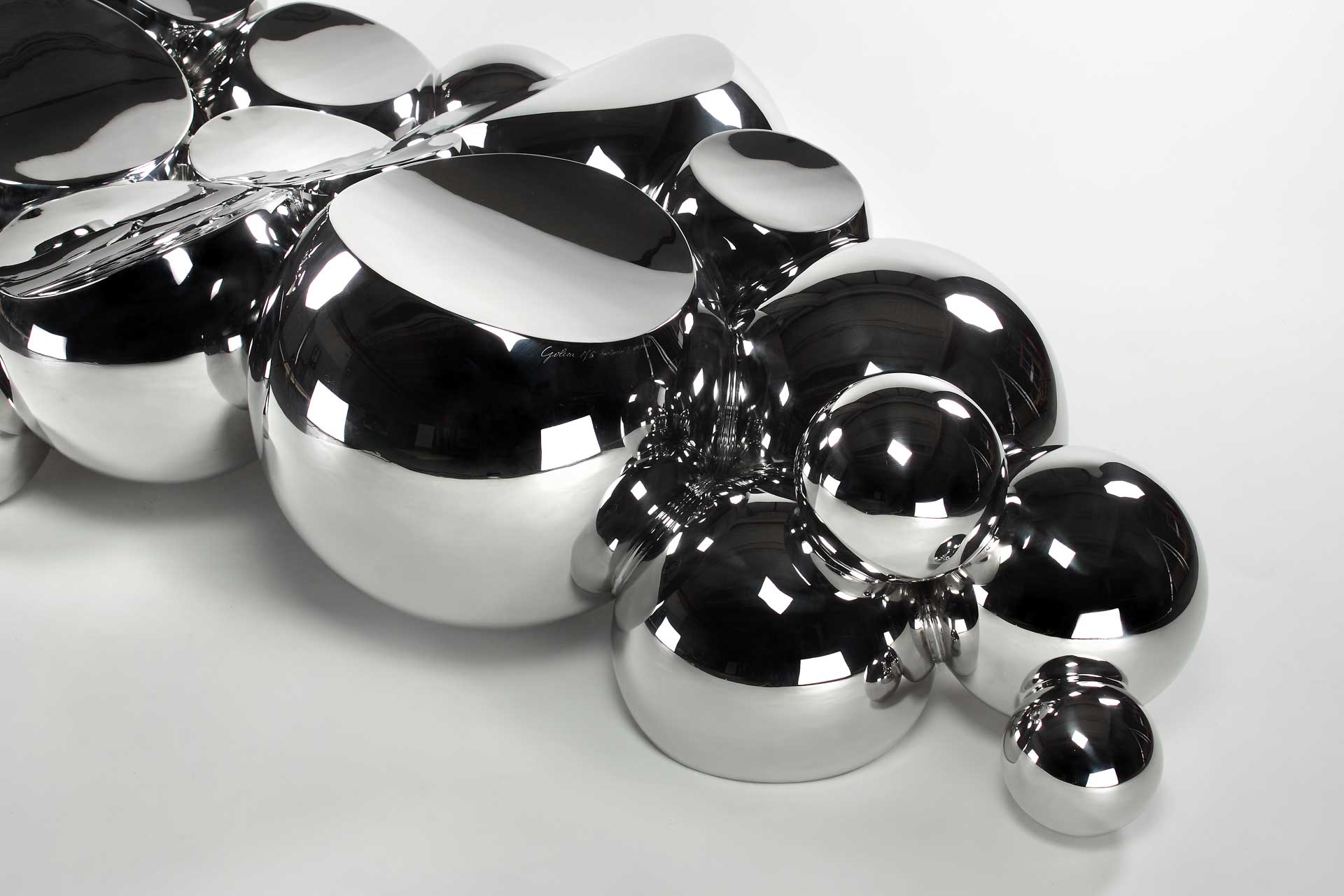 L’acciaio si fonde, sbatte roboante, si unisce violento pezzo su pezzo, sfera su sfera; aggregato informe di fredda materia d’acciaio,mostro inquietante. L’imperfezione porta alla trasformazione, lentamente si forma, brilla e inizia silenziosamente a vivere. Ciò che è creato era prima spirito e idea dell’uomo che ora si riflette sul suo lucido acciaio, mostro oscuro colui che osservandola vedrà il riflesso della sua anima malvagia.