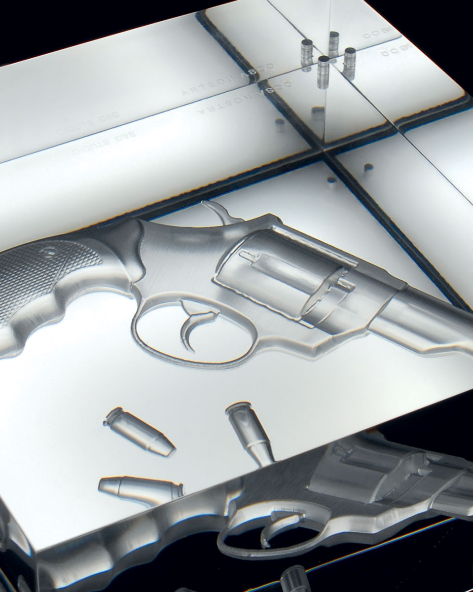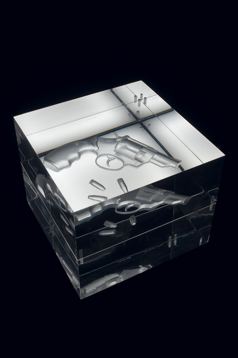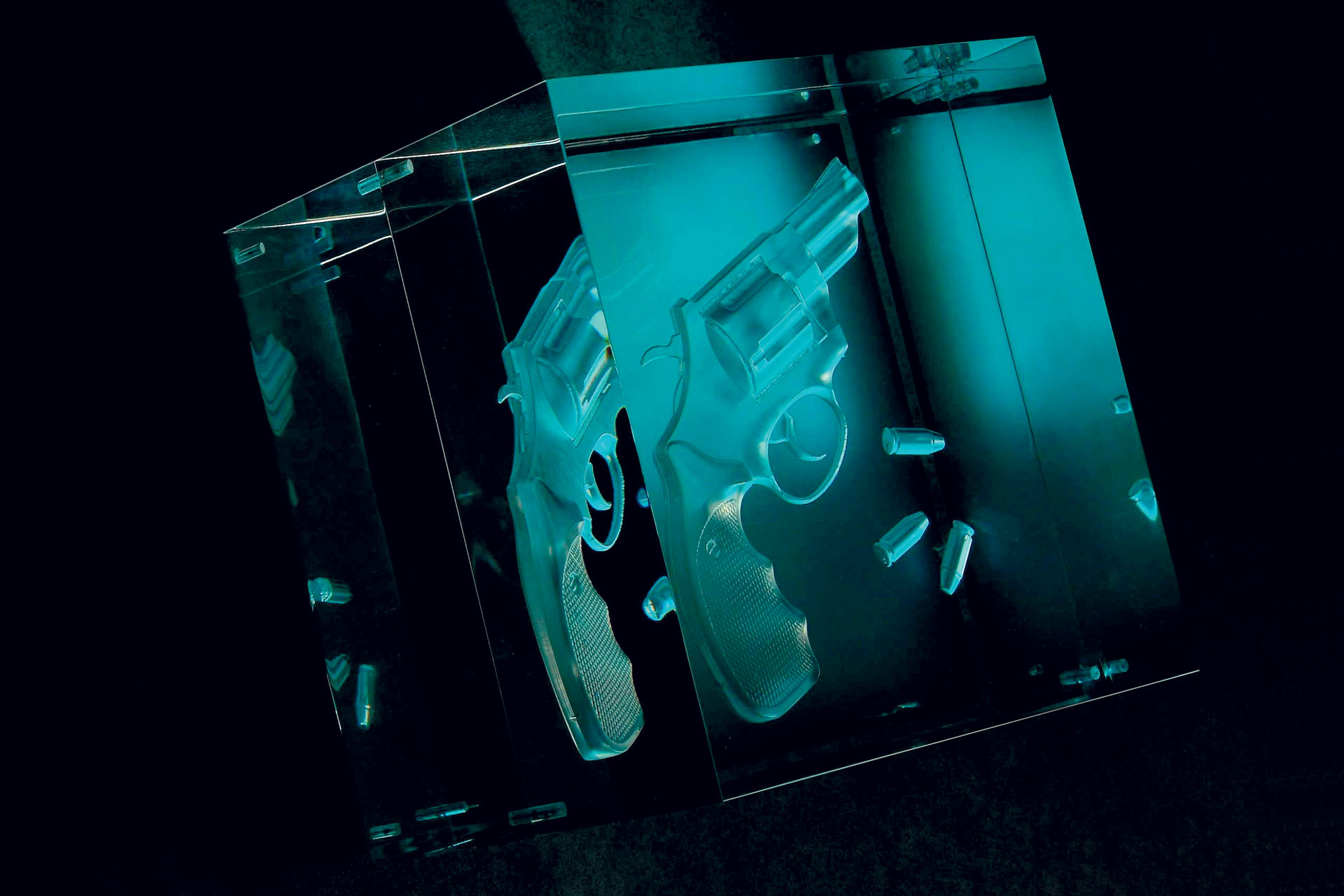 Observing from different angles the reflection creates the sight of one or more revolvers drawning in the acrylic glass: impossibile to understand which is the real or the reflected image.