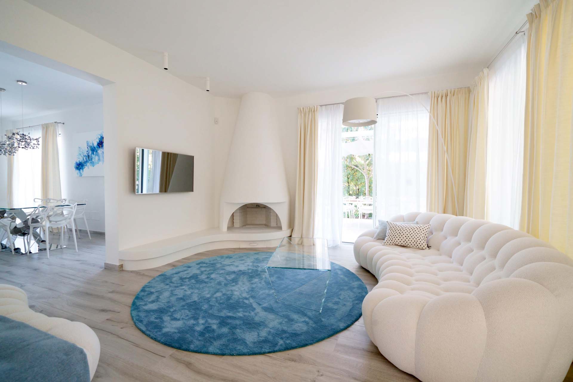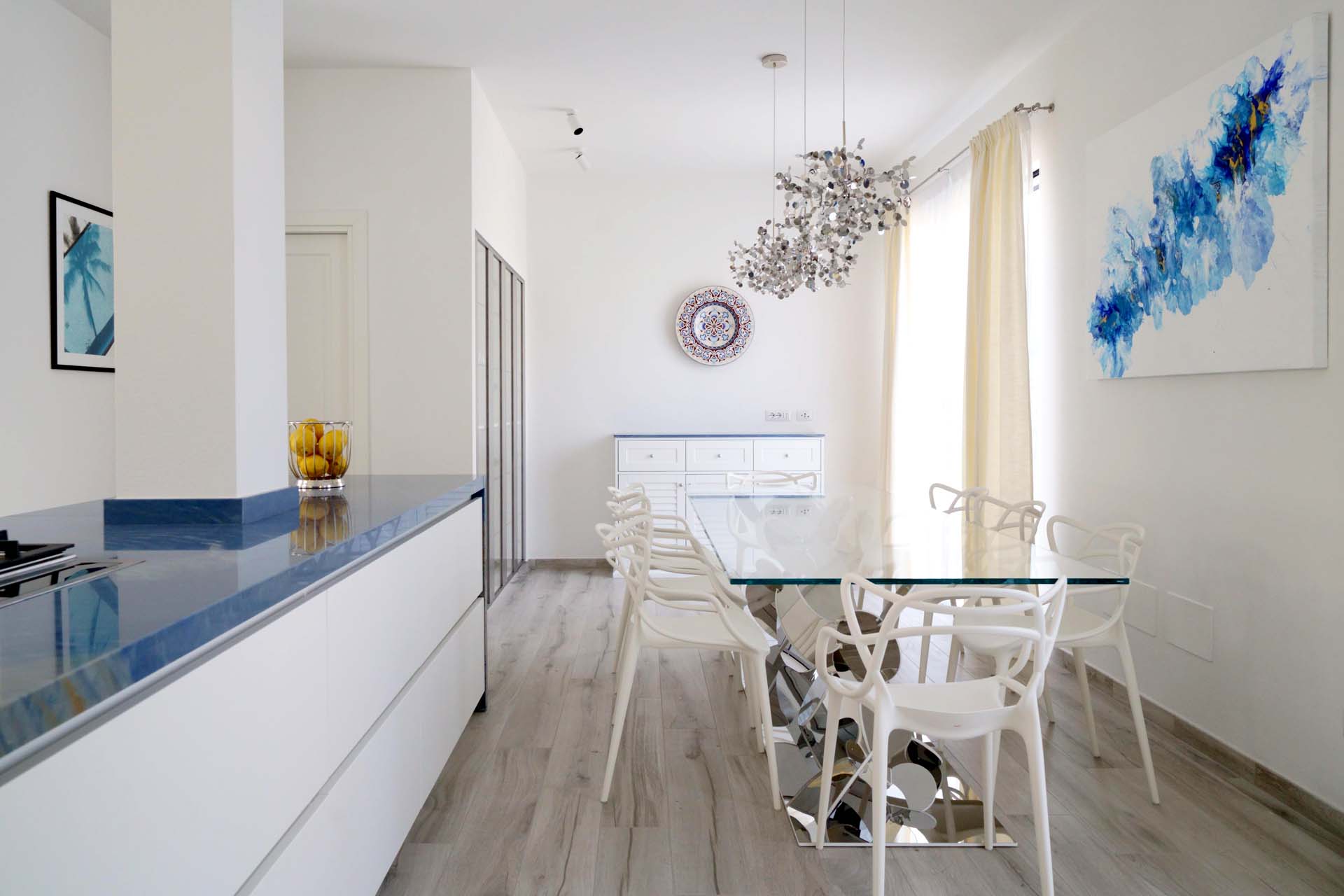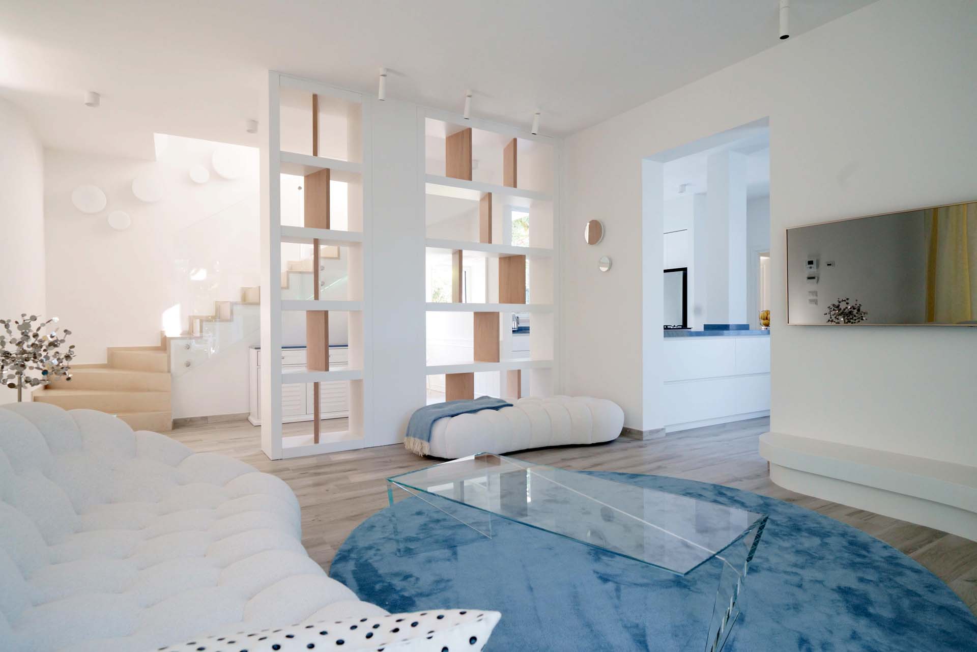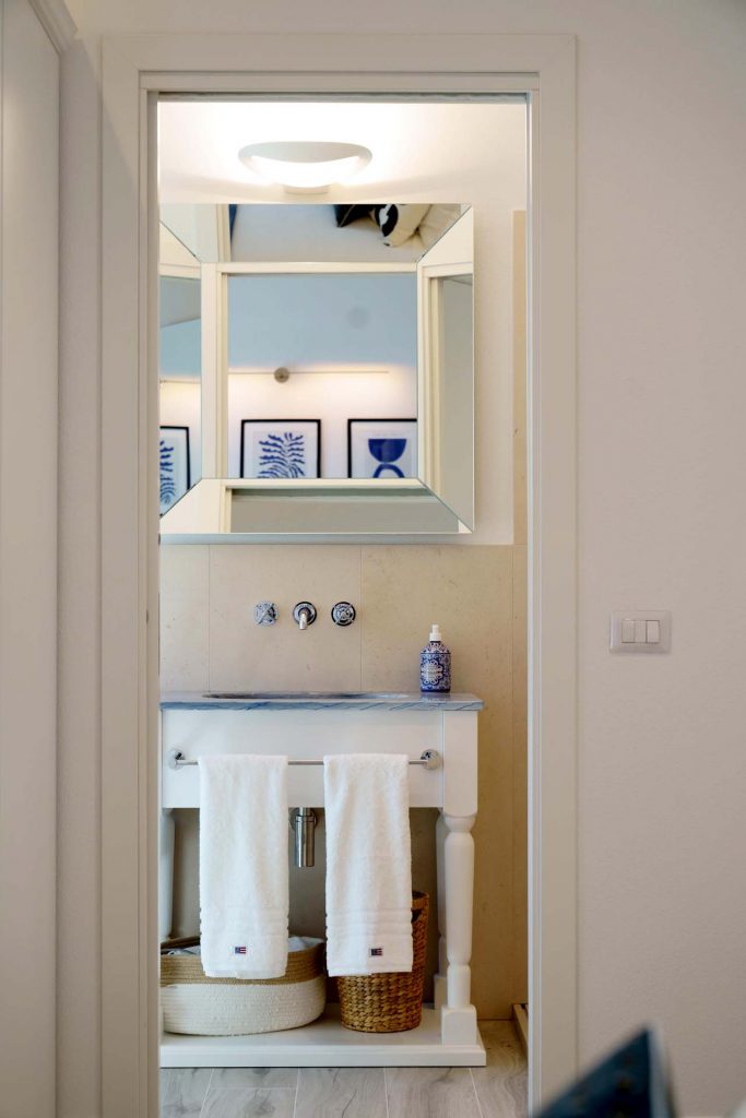 The light tones of the interior, reminiscent of fine sand, salt-worn wood or the blinding stone of the Apuan Alps, are interrupted by the blue of the Azul Macaubas, bringing to mind fragments of sky and sea, the perfect synthesis of Versilia.
