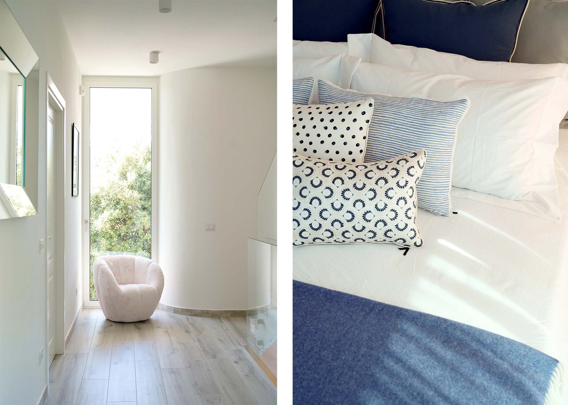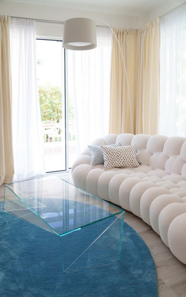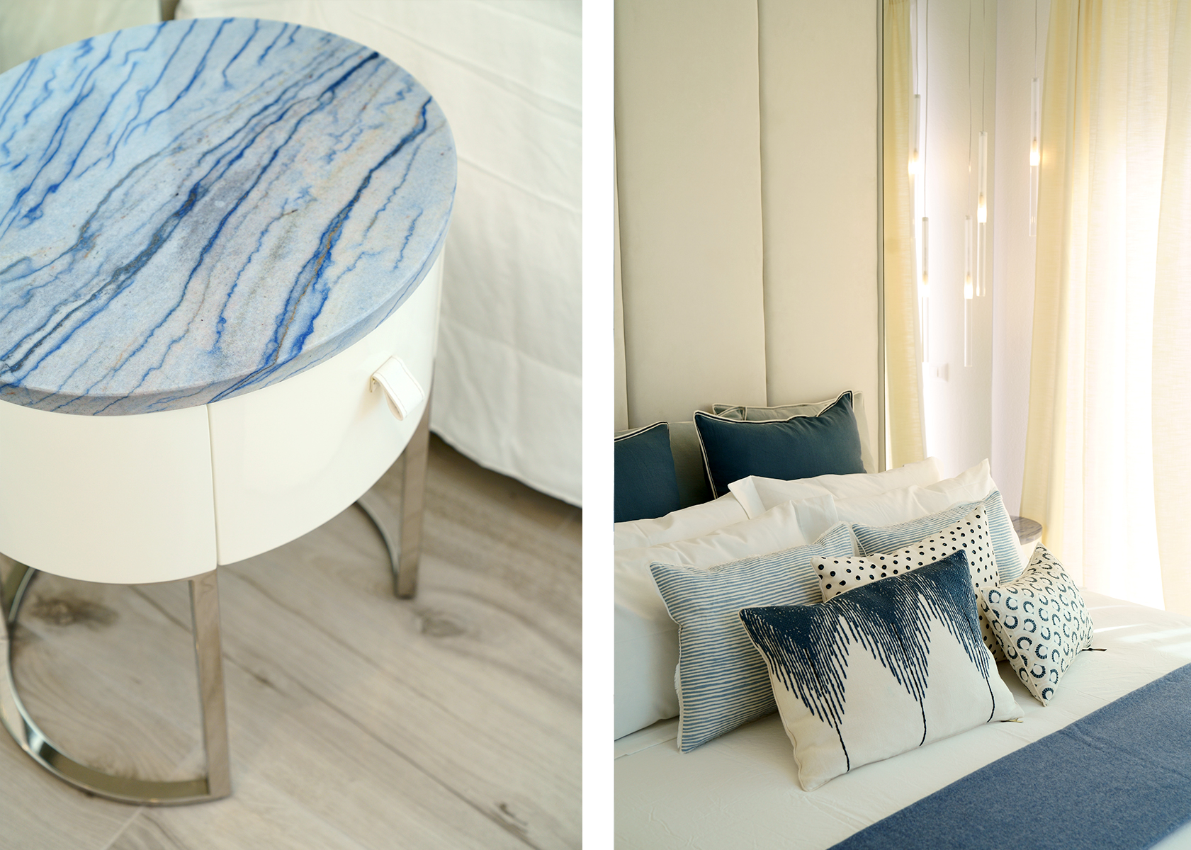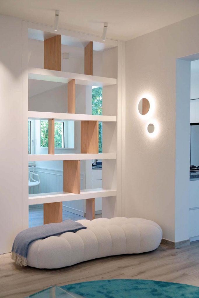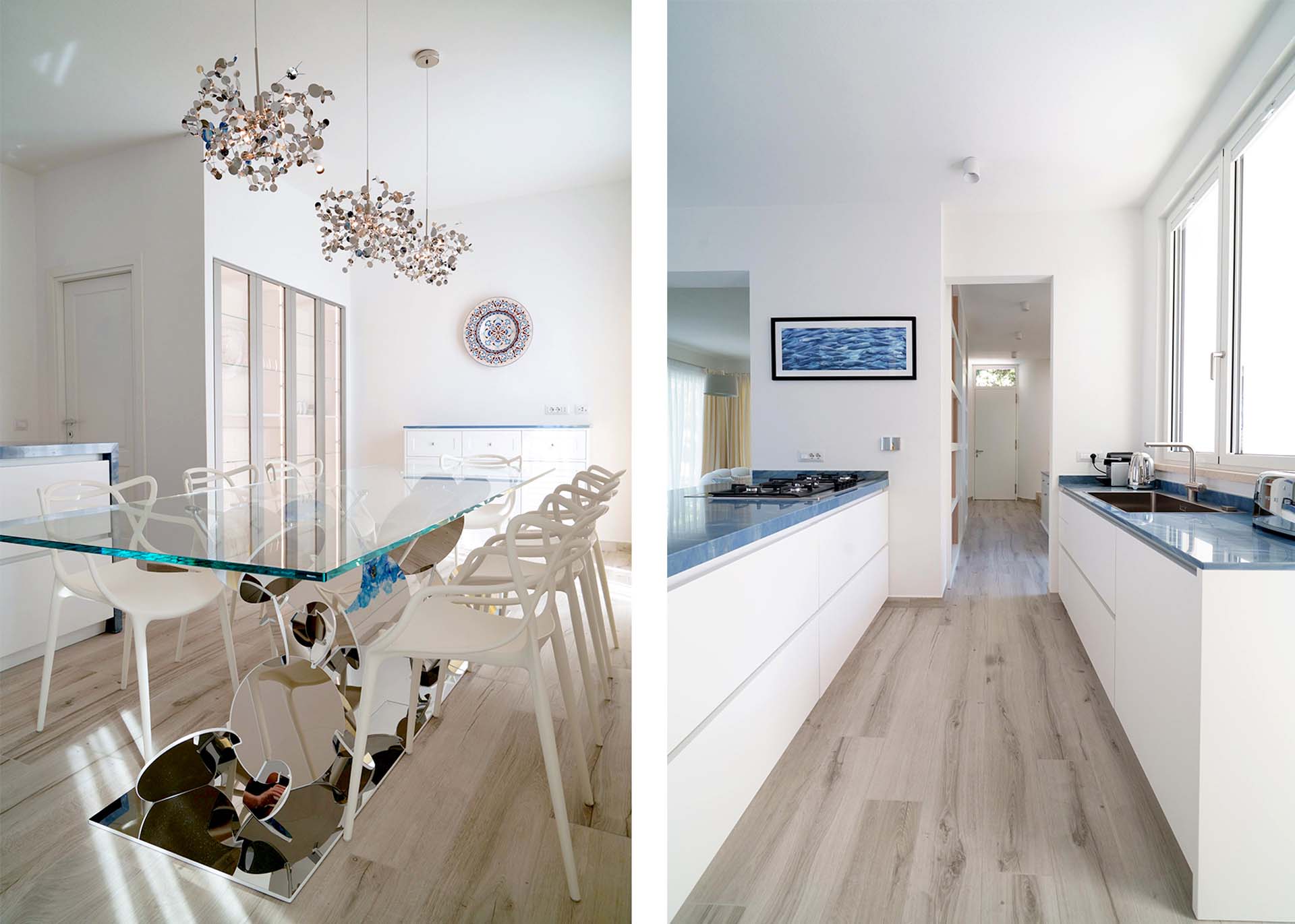 The light tones of the interior, reminiscent of fine sand, salt-worn wood or the blinding stone of the Apuan Alps, are interrupted by the blue of the Azul Macaubas, bringing to mind fragments of sky and sea, the perfect synthesis of Versilia.