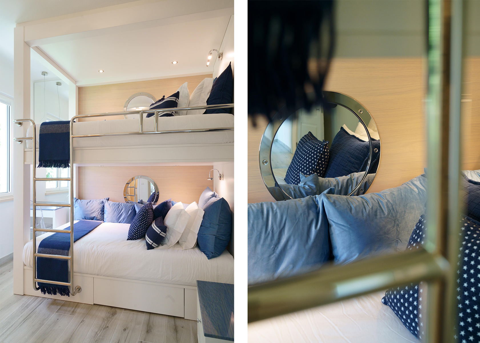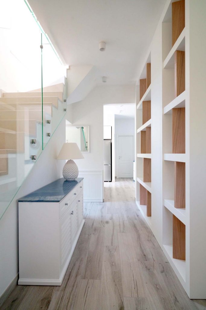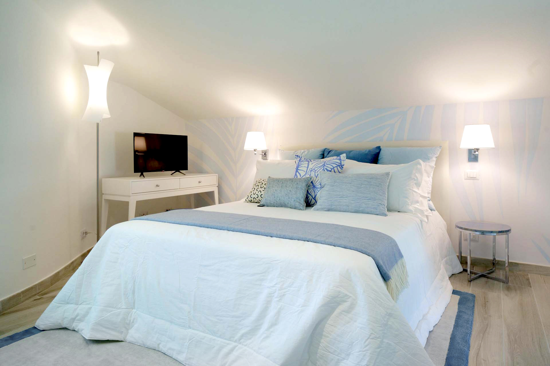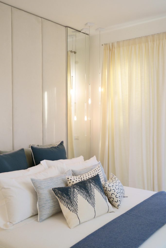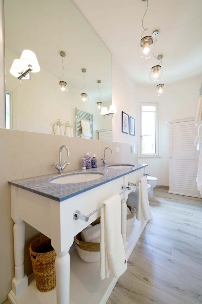 The light tones of the interior, reminiscent of fine sand, salt-worn wood or the blinding stone of the Apuan Alps, are interrupted by the blue of the Azul Macaubas, bringing to mind fragments of sky and sea, the perfect synthesis of Versilia.