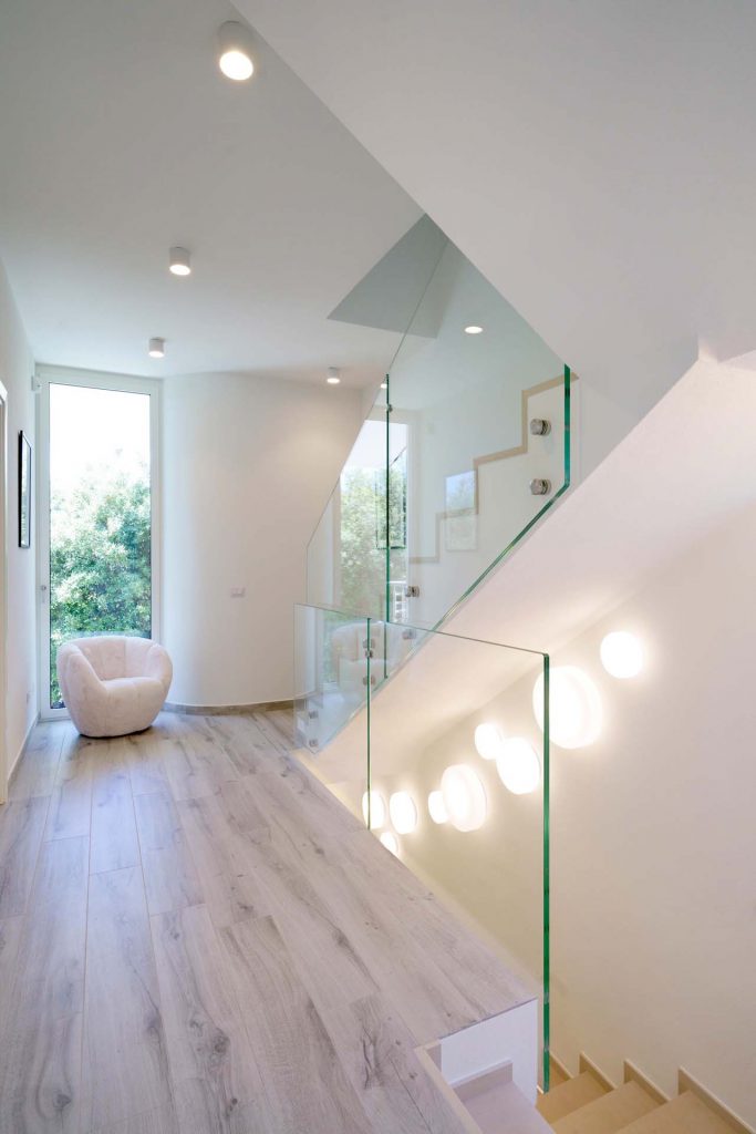 The redesign of the spaces made it possible to obtain four rooms with bathrooms for exclusive use, while the facades of the building were modified by creating four large glazed openings, allowing the visual axes inside the villa to always be rich in landscaping.