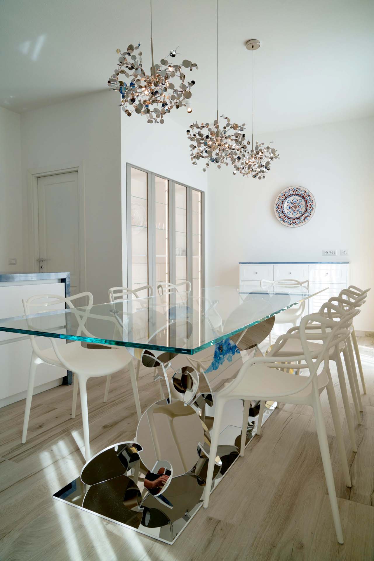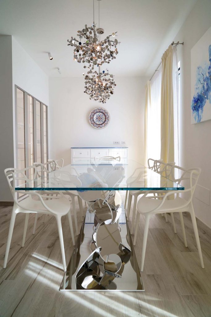 In the living area, some works by Barberini & Gunnell stand out: the brand new Flake sculptural table, designed exclusively for the Bocelli family, and two Origami tables in extra-clear glass, a classic in the Barberini & Gunnell collection.