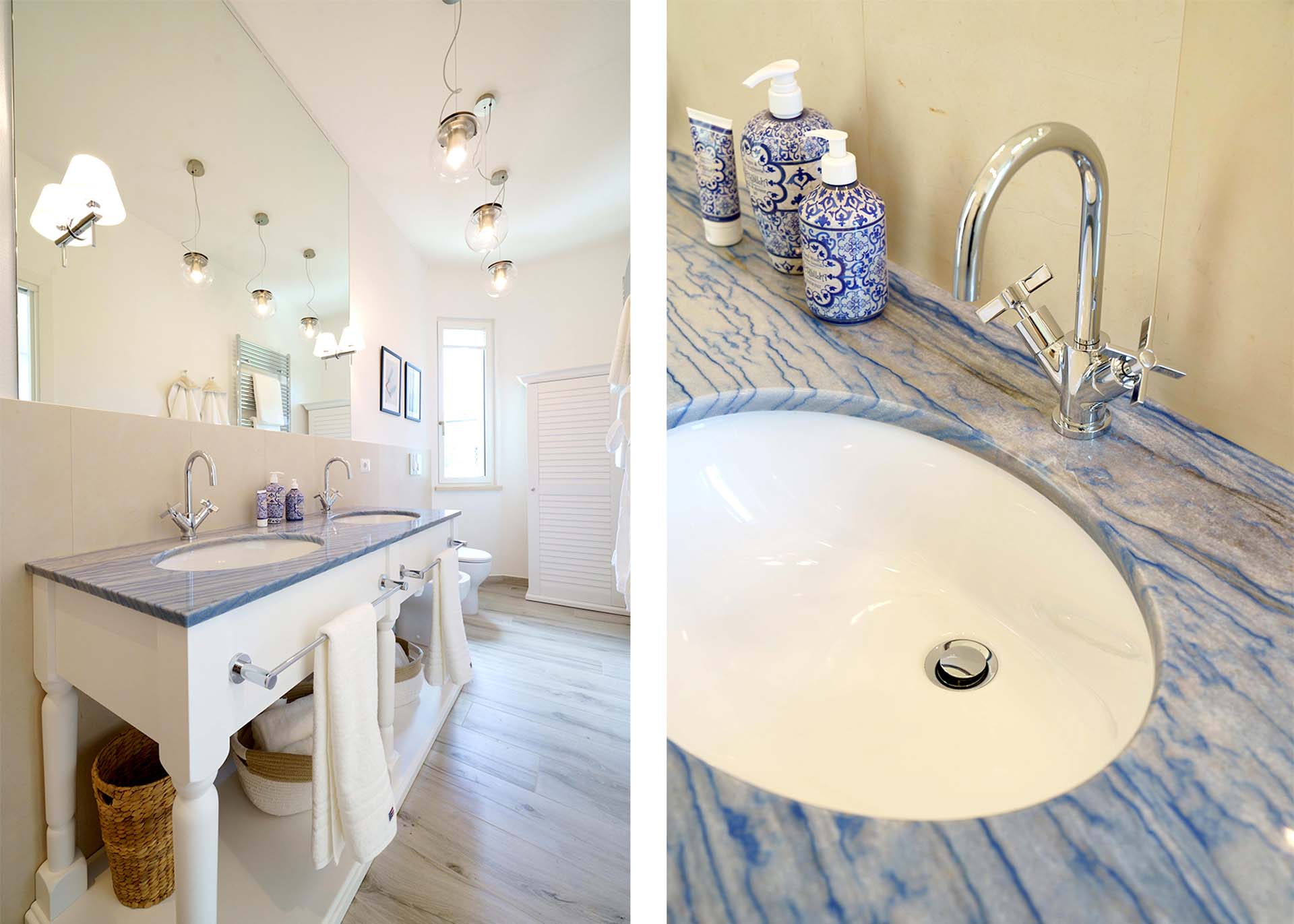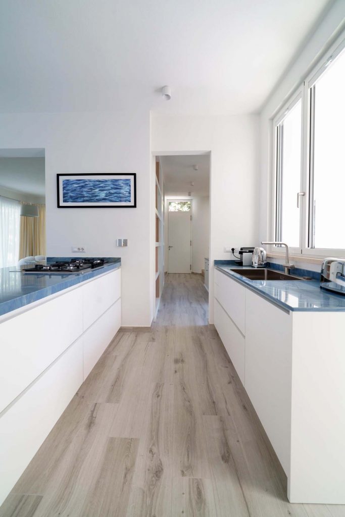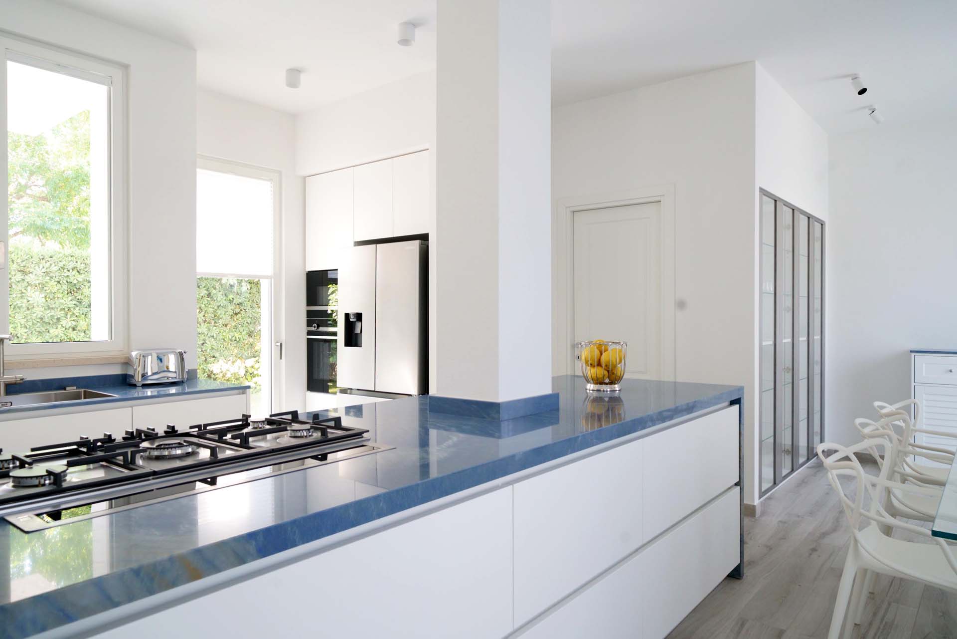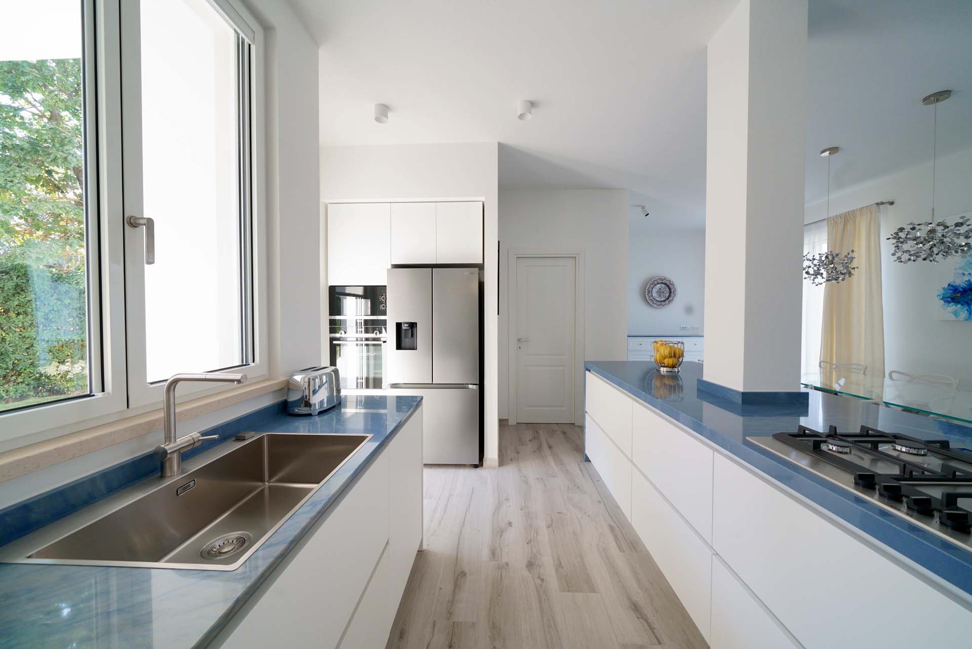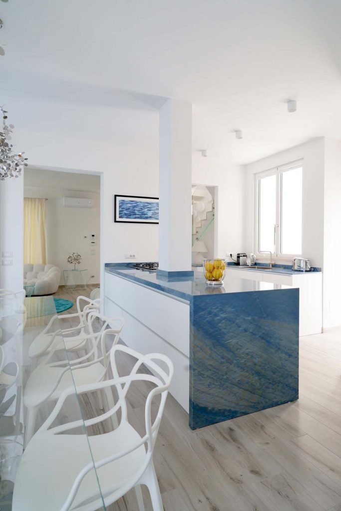Azul macaubas is the protagonist of this project, in fact it unites all the rooms, starting from the kitchen worktop and arriving in the rooms and bathrooms, each time different in its thousands of shades, sometimes as clear as the sky others as rippling as the sea.