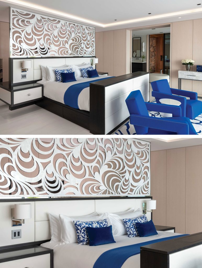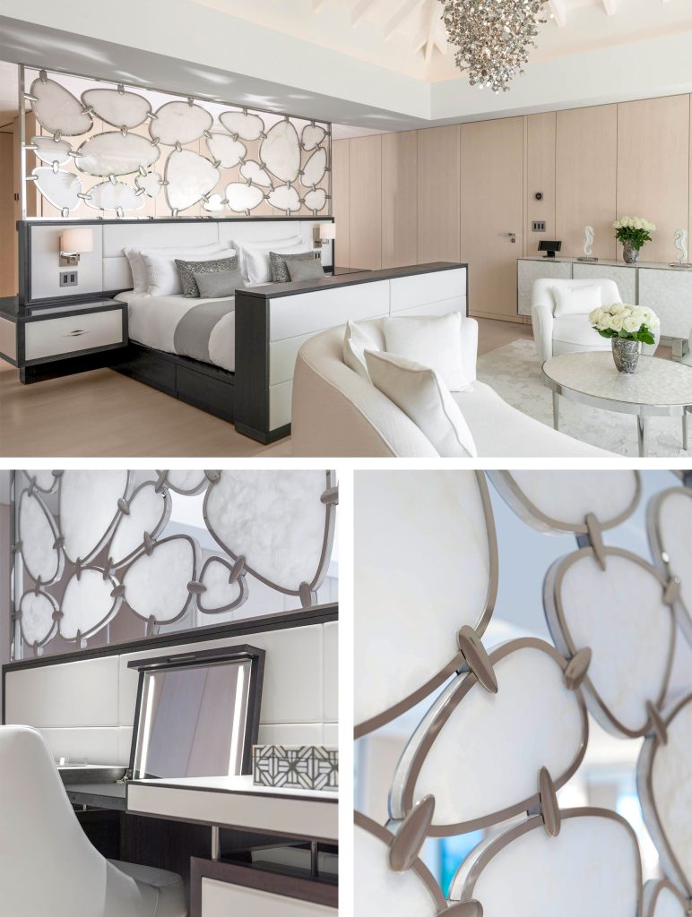To embellish the suites, Barberini & Gunnell custom designed and created the room dividers and hand knotted rugs, made from the purest white onyx, mother of pearl and silk.